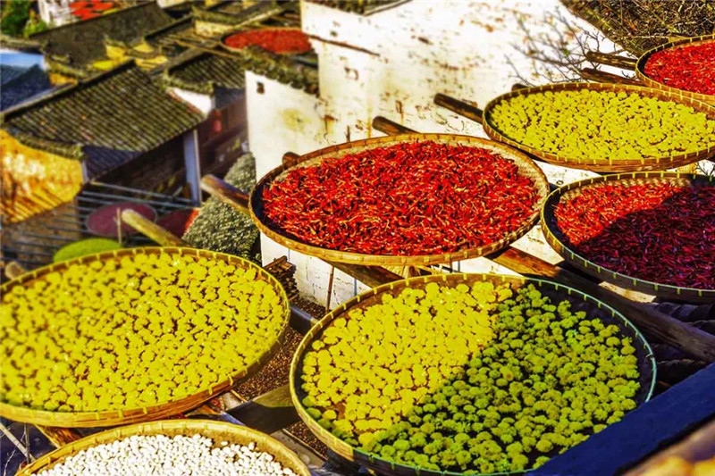 民国时期出版的《首都志》记载:“立秋前一日,食西瓜,谓之啃秋。”晒秋是一种典型的农俗现象,具有极强的地域特色。在湖南、广西、安徽、江西等生活在山区的村民,由于地势复杂,村庄平地极少,只好利用房前屋后及自家窗台屋顶架晒、挂晒农作物,久而久之就演变成一种传统农俗现象。